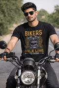 The “Bikers Rule – Live to Ride” tee features a bold skull rider graphic with wings and vintage detailing, capturing the raw spirit of the road. It is made for riders, dreamers, and anyone who lives for freedom and throttle.